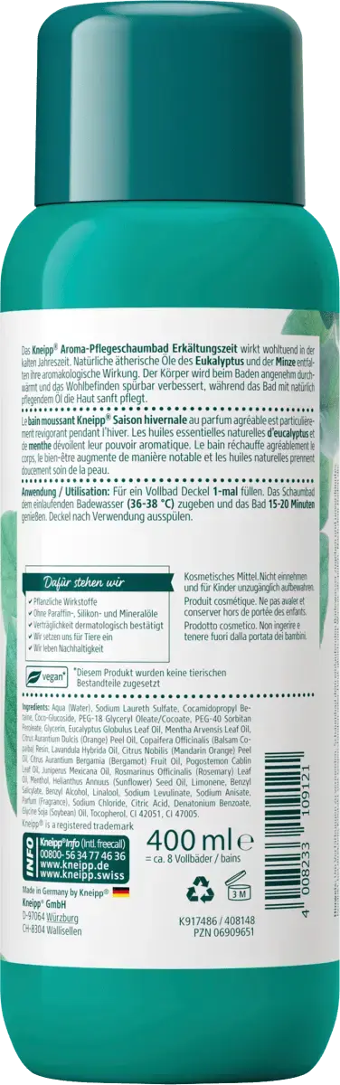 Арома-уход Кнайпа пенная ванна Холодное время года благотворно влияет в холодное время года. Натуральные эфирные масла эвкалипта и мяты проявляют аромалогическое действие. Тело приятно разогревается, а самочувствие заметно улучшается. Взаимодействие освобождающего аромата, насыщенного цвета и стойкой пены делает эту ванну целостным наслаждением для всех чувств.