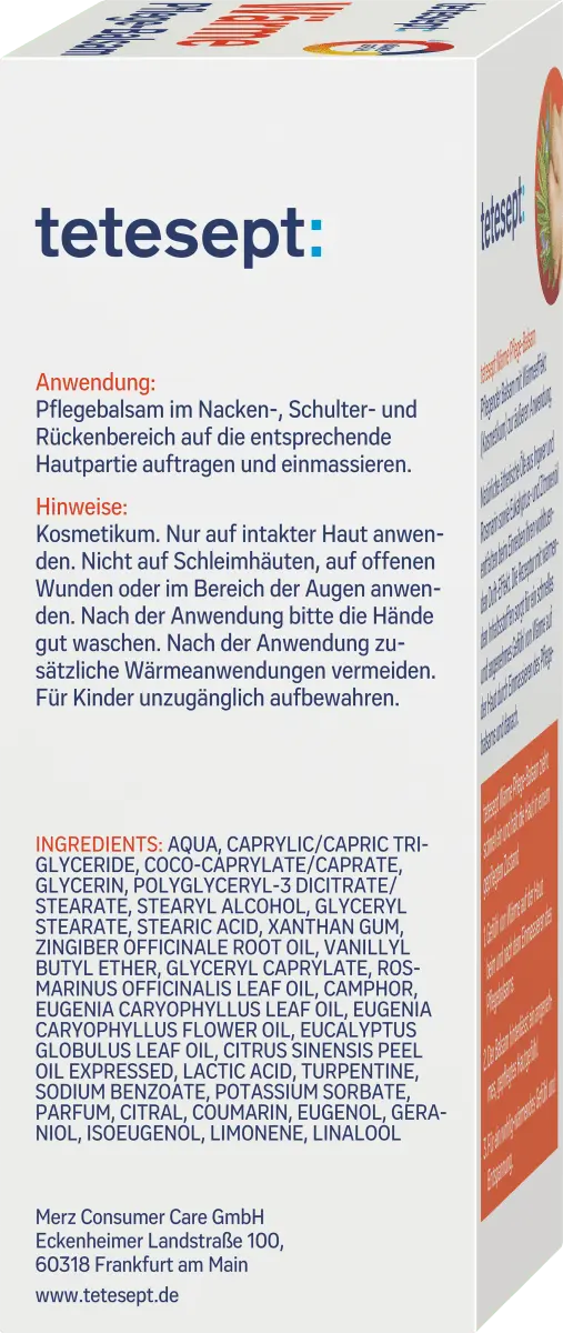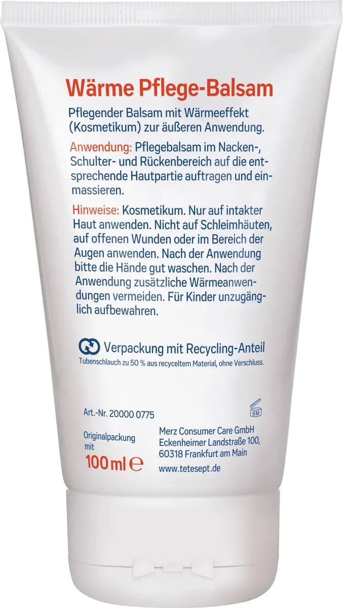 Применение: Нанесите уходовый бальзам на соответствующий участок кожи в области шеи, плеч и спины и массируйте. Примечания: косметические. Используйте только на неповрежденной коже. Не используйте на слизистых оболочках, открытых ранах и вокруг глаз. Пожалуйста, тщательно мойте руки после использования. После использования избегайте дополнительных применений тепла.