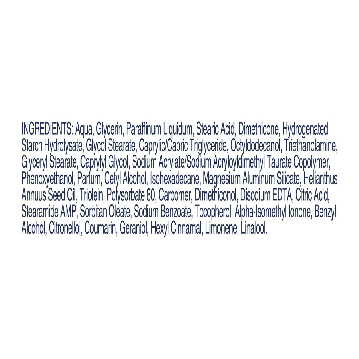 br> Ингредиенты: аква, глицерин, парафиновый жидкость, стеариновая кислота, диметикон, гидролизат гидрогенизированного крахмала, гликол стеарат, каприменный/каприрический триглицерид, октилодеканол, триэтаноламин, стират -глицил -пенрол, ацерим -ацерим -пенрол -пенрол -ацил -ацил -пенрол -ацил -пенрол , Parfum, cetyl Спирт, изогексадекан, алюмосиликат магния, масло семян Helianthus Annuus, триолеин, полисорбат 80, карбомер, диметиконол, динатрий ЭДТА, стеарамид АМП, сорбитанолеат, токоферол, лимонная кислота, альфа-изометилионон, бензиловый спирт, цитронеллол, кумарин, гексилциннамал. , Лимонен, Линалоол. Ингредиенты: вода, глицерин, жидкий парафин, стеариновая кислота, диметикон, гидрогенизированный гидролизат крахмала, стеарат гликоля, каприловый/каприновый триглицерид, октилдодеканол, триэтаноламин, глицерилстеарат, каприлилгликоль, сополимер акрилата натрия и акрилоилдиметилтаурата натрия, феноксиэтанол, отдушка, цетиловый спирт. , изогексадекан, алюмосиликат магния, масло семян Helianthus Annuus, триолеин, полисорбат 80, карбомер, диметиконол, динатрий ЭДТА, лимонная кислота, стеарамид АМП, сорбитан олеат, бензоат натрия, токоферол, альфа-изометилионон, бензиловый спирт, цитронеллол, кумарин, Гераниол, гексил циннамал, лимонен, линалоол.