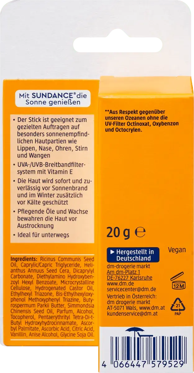 Солнцезащитный стик SUNDANCE с солнцезащитным фактором 30 идеален для чувствительных к солнцу участков кожи, таких как нос и уши, лоб и щеки. Он обеспечивает обширную немедленную защиту, а также защищает от холода зимой. Благодаря практичной форме карандаша защиту от UVA и UVB можно наносить целенаправленно и легко. Совместимость с кожей одобрена дерматологами. Водонепроницаемость* (*Независимый испытательный институт подтверждает: после 40 минут пребывания в воде сохраняется не менее 50 % заявленного солнцезащитного фактора). Из уважения к нашим океанам, без УФ-фильтров октиноксата, оксибензона и октокрилена. Веган.