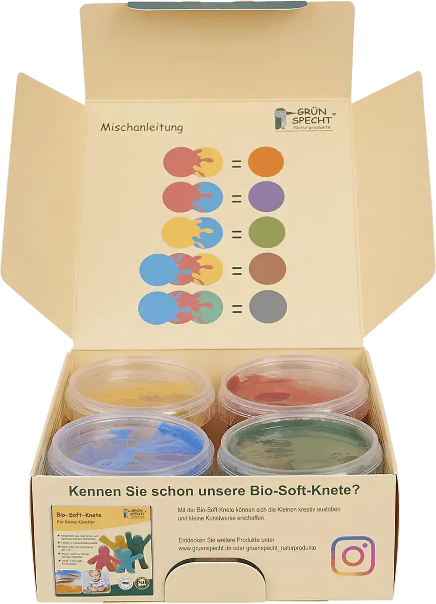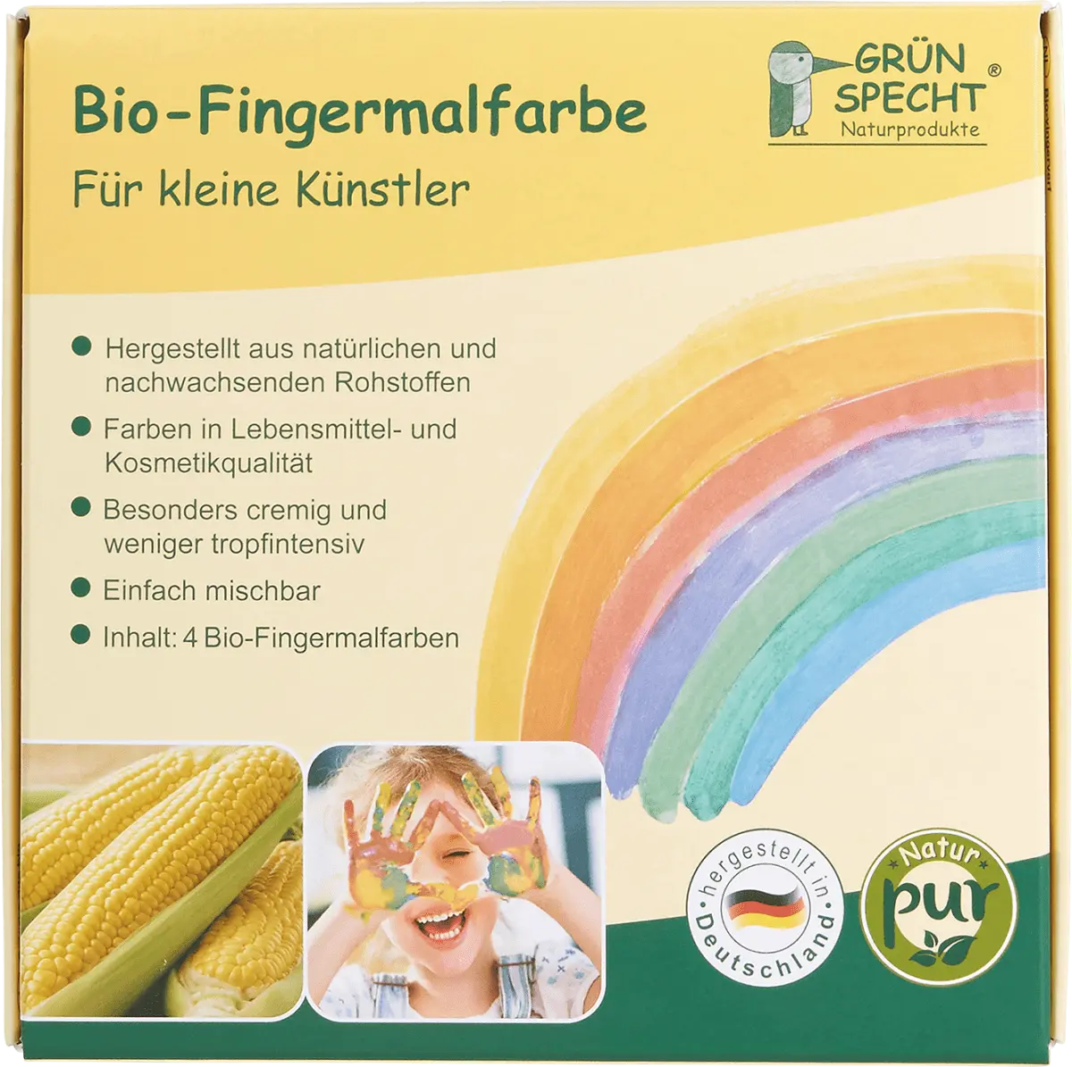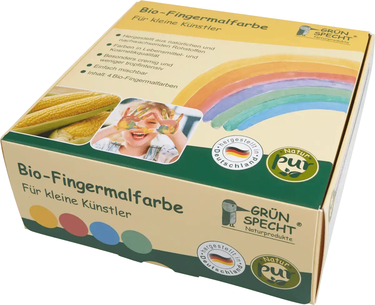4 органические пальчиковые краски Grünspecht идеально подходят для бумаги, картона, дерева и камня и легко смешиваются друг с другом. Они изготовлены из натурального, возобновляемого сырья с использованием растительных и минеральных пигментов пищевого или косметического качества. Они были протестированы независимым испытательным институтом в соответствии со стандартом игрушек DIN EN 71-7 и в соответствии со стандартом содержат горькое вещество, поэтому малыши не слизывают краску с пальцев и не проглатывают ее.