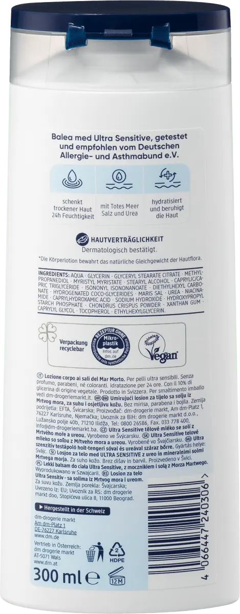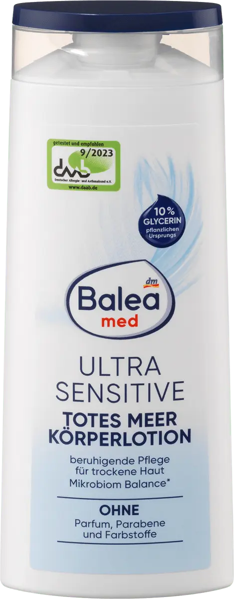 Лосьон для тела Balea Med Ultra Sensitive Dead Sea с натуральными минеральными солями и мочевиной питает кожу, склонную к раздражению, и обеспечивает ей 24-часовое увлажнение. Для приятного ощущения кожи в течение всего дня. Нежная формула ухода увлажняет сухую кожу и поддерживает естественный кожный барьер. Лосьон также обогащен 10% растительным глицерином, солью Мертвого моря и мочевиной. Переносимость кожей проверена дерматологами. Рецептура без микропластика и водорастворимых, чисто синтетических полимеров.