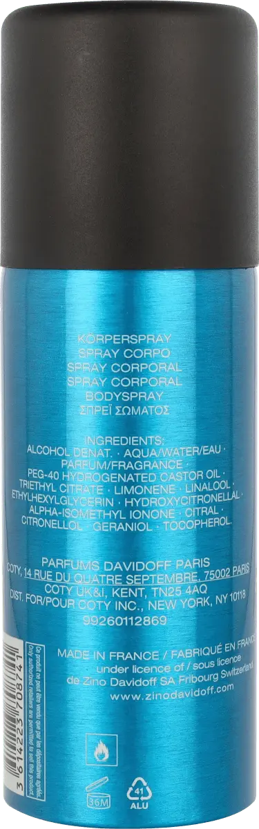 Спрей для тела Cool Water от Davidoff придаст вашему внешнему виду свежесть. База спрея состоит из мускуса, дубового мха, амбры, кедра и табака. Сердце состоит из жасмина, сандала, нероли и герани. В верхних нотах присутствуют ноты кориандра, мяты, калона, лаванды, зеленых нот, морской воды и розмарина.