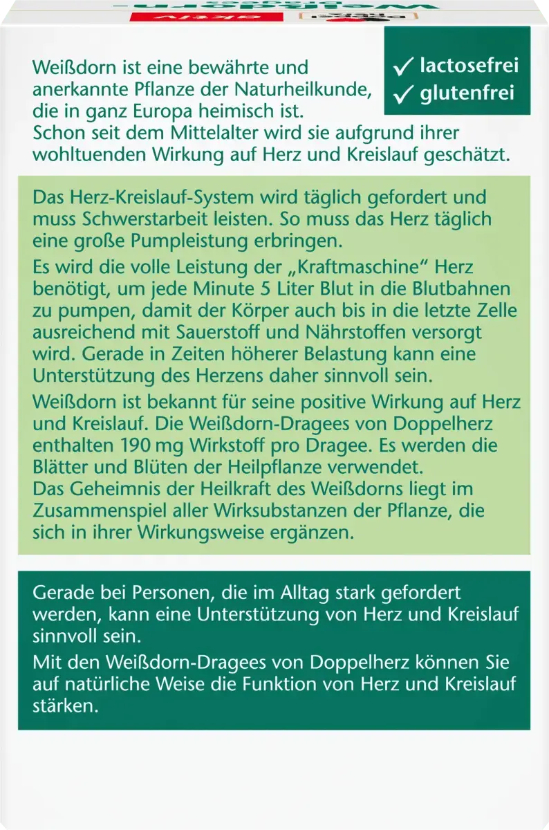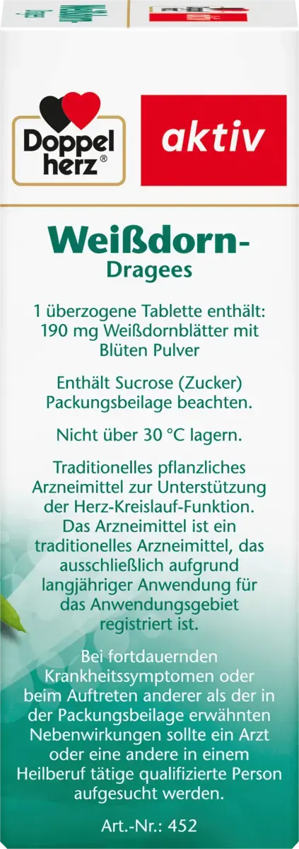 Таблетки боярышника Доппельгерц поддерживают сердечно-сосудистую функцию с помощью растительных веществ из листьев и цветков боярышника. Драже не содержат глютена и лактозы. Веган.