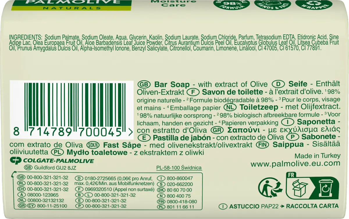 С куском мыла Moisture Care от Palmolive ваши руки можно очистить в мгновение ока. Помимо очистки, твердое мыло бережно питает и источает фруктовый аромат оливок. Для бережного очищения и ухода за руками.