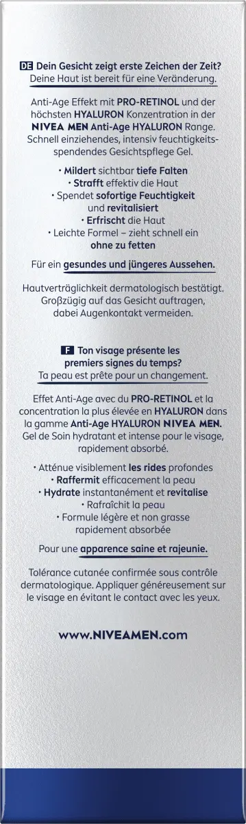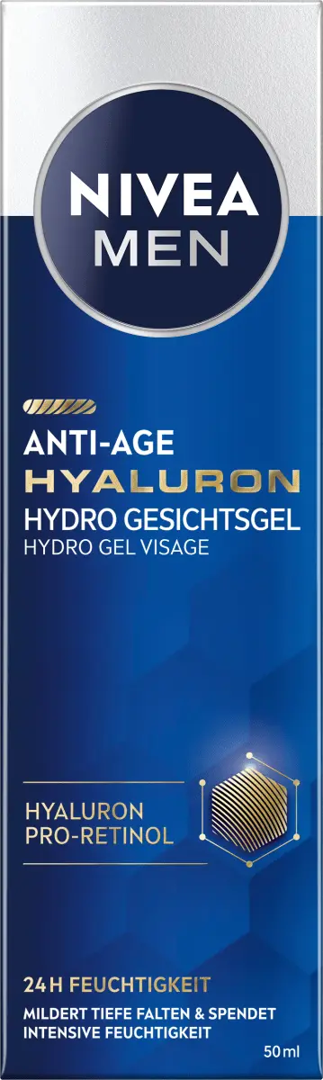 Антивозрастной гиалуроновый гидроуход для лица гель NIVEA MEN быстро впитывается в кожу и обеспечивает ощущение свежести. Благодаря высочайшей концентрации гиалуроновой кислоты гель способен уменьшить даже глубокие морщины. Кроме того, кожа подтягивается и интенсивно увлажняется до 24 часов, не становясь жирной.