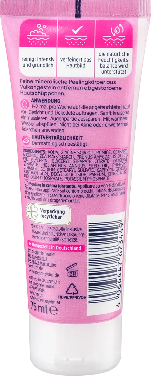 Крем-пилинг Balea обеспечивает приятное и эффективное очищение лица. Мелкие минеральные пилинговые тела, изготовленные из вулканического камня, освобождают кожу от омертвевших клеток и оставляют эластичный, мягкий результат. Содержащееся в нем миндальное масло обеспечивает дополнительный уход и поддерживает естественный баланс влаги. Рецепт без микропластика и водорастворимых, чисто синтетических полимеров.