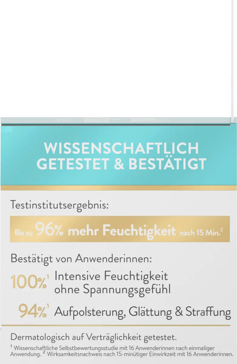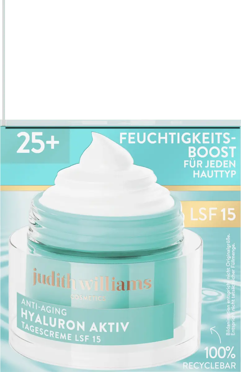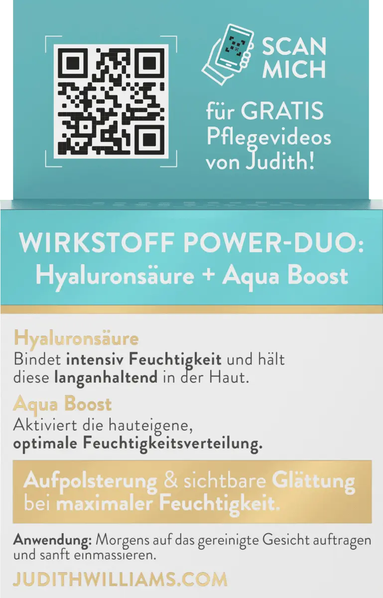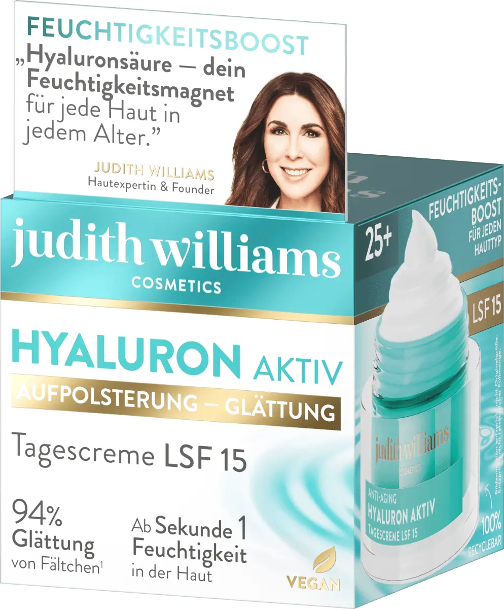 Увлажняющий дневной крем Hyaluron Aktiv от Judith Williams оснащен SPF 15 и гиалуроновой кислотой, а также имеет Aqua Boost. Это дает вам до 81% больше влаги всего за 20 минут. Идеально подходит для пухлой и гладкой кожи.