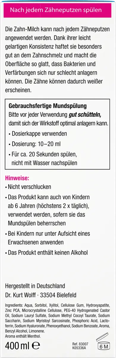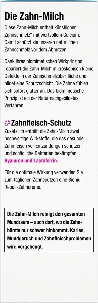 . Зубное молочко Bioniq Repair содержит искусственную зубную эмаль (гидроксиапатит) с ценным кальцием. Это защищает естественную зубную эмаль от износа. Зубное молочко очищает всю полость рта, даже там, где зубной щетке трудно добраться. Кариес зубов, неприятный запах изо рта и проблемы с деснами предотвращаются. Также он содержит два активных ингредиента, которые защищают здоровые десны от воспаления и борются с вредными бактериями: гиалуроновую кислоту и лактоферрин.