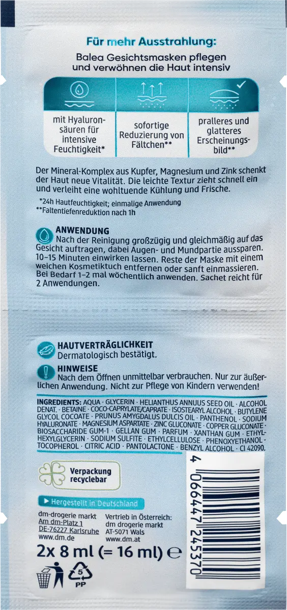 Гиалуроновая маска от Balea обеспечивает коже интенсивное увлажнение на срок до 24 часов*. Формула с гиалуроновой кислотой обеспечивает более упругий и гладкий вид, а морщины мгновенно сокращаются.** Минеральный комплекс меди, магния и цинка придает коже новую жизненную силу. Легкая текстура быстро впитывается и обеспечивает приятное охлаждение и свежесть. Рецепт без микропластика и водорастворимых, чисто синтетических полимеров. *24-часовая влажность кожи; Одноразовое использование **Уменьшение глубины морщин через 1 час.