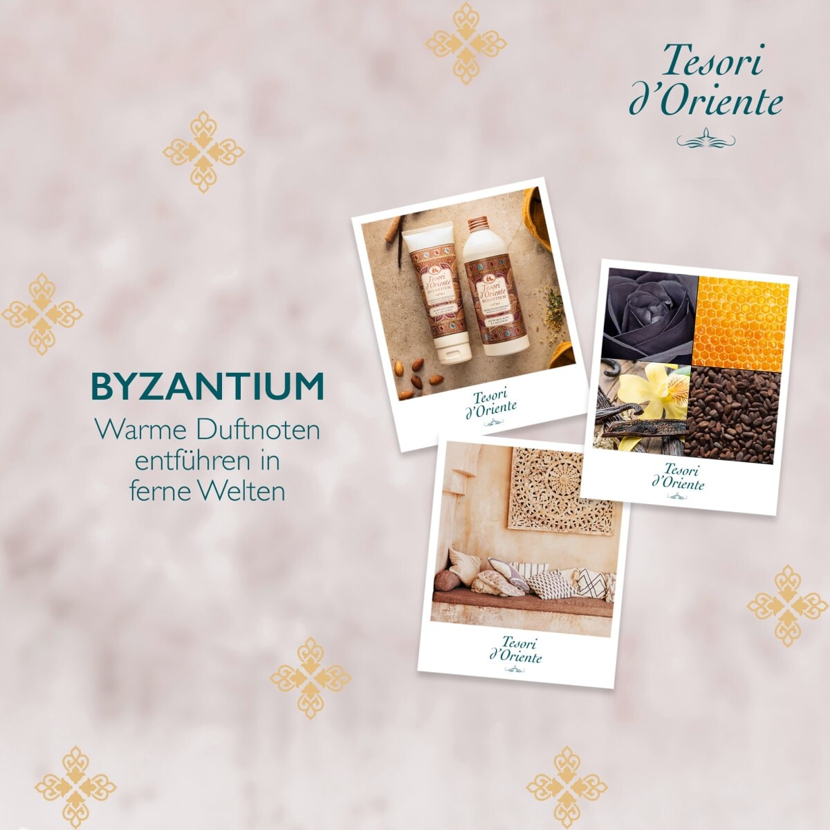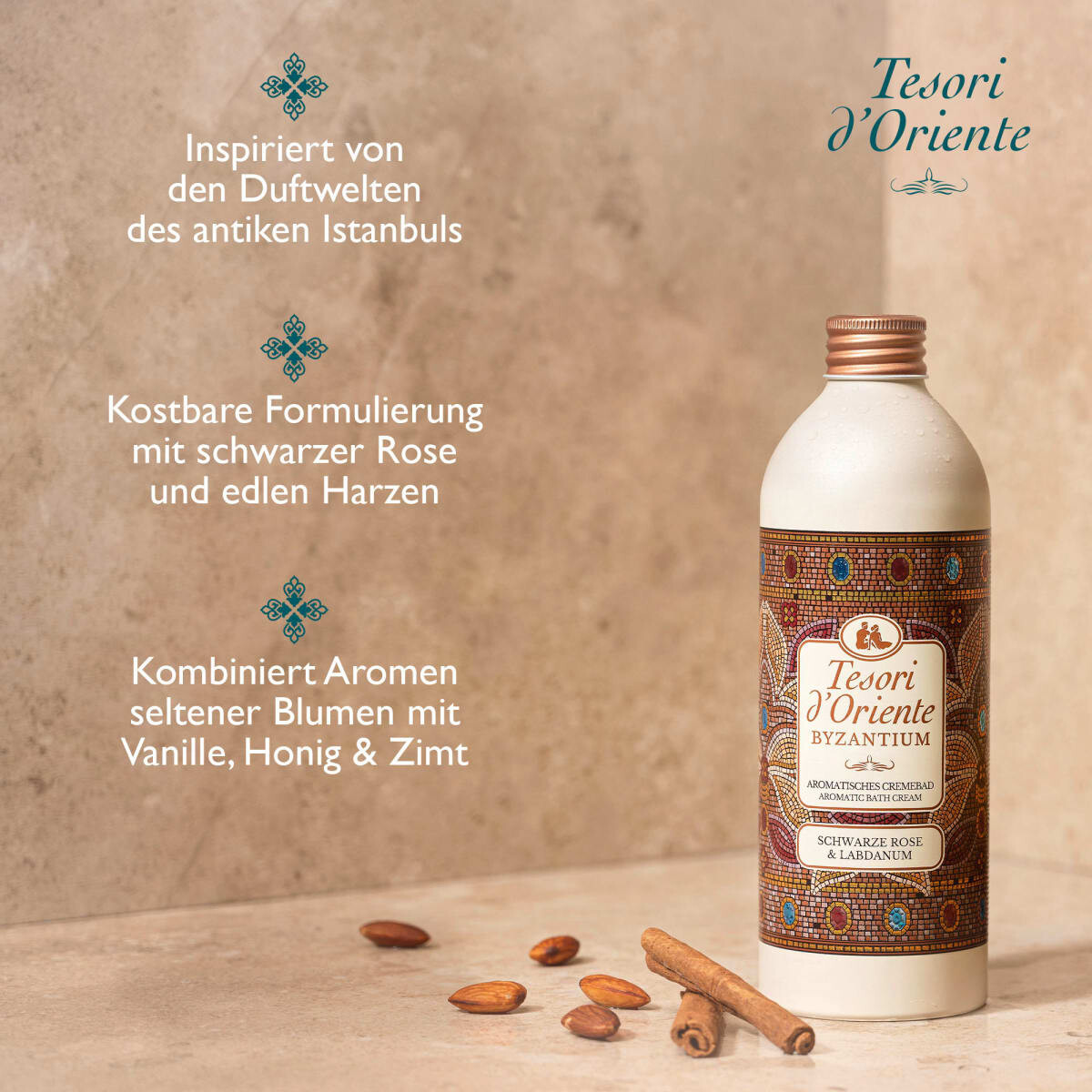 Уходовая ванна Byzantium от Tesori d'Oriente был вдохновлен великолепными дворцами древнего города Византии и превращает каждую ванную комнату в храм благополучия. Благодаря специальной формуле тело бережно очищается. Сочетание ароматов редких цветов и тонких смол переносит чувства в древние, восточные миры.