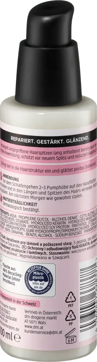 Флюид для волос Keratin Repair Over Night от Balea Professional защищает волосы от трения во время сна. Формула ухода с кератином и пептидами надолго запечатывает поврежденные кончики волос после первого применения, защищает от новых секущихся кончиков и уменьшает ломкость волос. Флюид проникает глубоко в структуру волос и сглаживает пористые участки. Рецепт без микропластика и водорастворимых, чисто синтетических полимеров.
