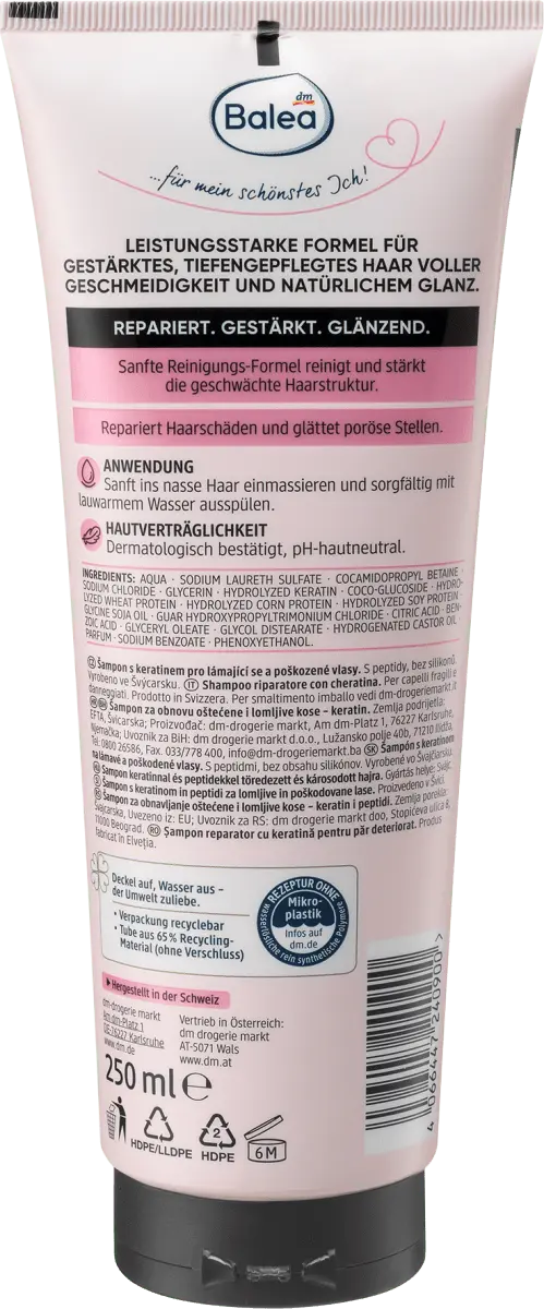 Шампунь Balea Professional Keratin восстанавливает поврежденные волосы и разглаживает их пористые волосы Место. Шампунь имеет мягкую очищающую формулу, благоприятную для кожи головы. Это укрепляет ослабленную структуру волос. Специальные строительные блоки волос, такие как кератин, сохраняются в структуре волос, помогают укрепить волокна волос и обеспечить улучшение качества волос. Уменьшает ломкость волос и придает естественный блеск, придавая им здоровый вид.