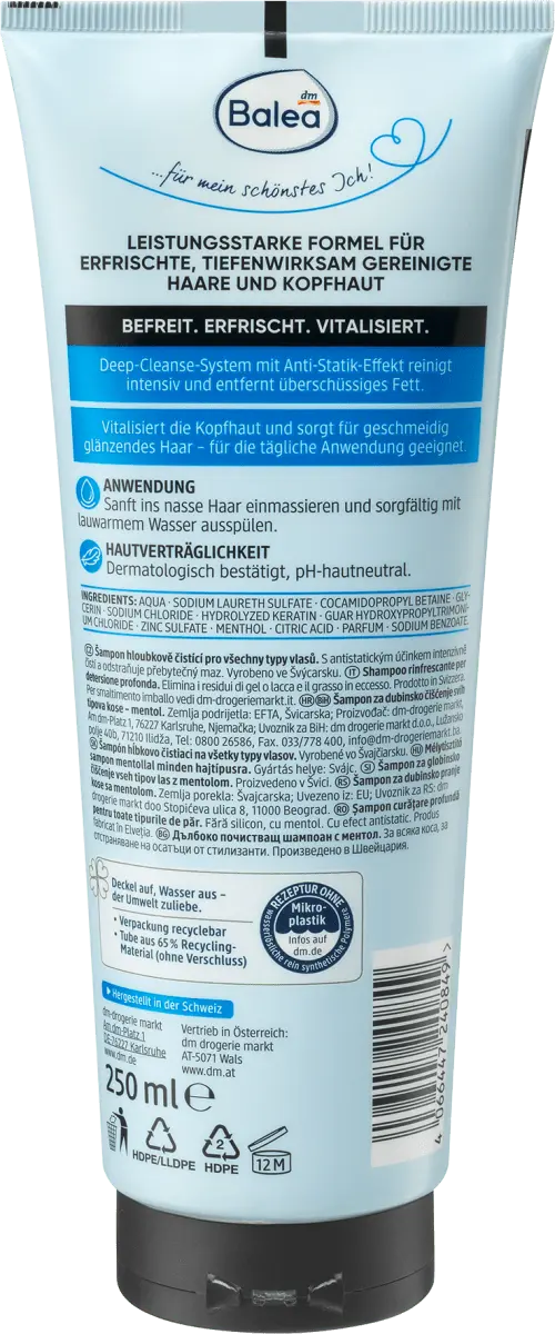 Шампунь глубокого очищения Balea Professional специально освобождает волосы от остатков стайлинговых средств и отложений. Для легких, оживленных волос с новым блеском. Результат – обновленные волосы и глубокое очищение волос и кожи головы. Совместимость с кожей также подтверждена дерматологически.