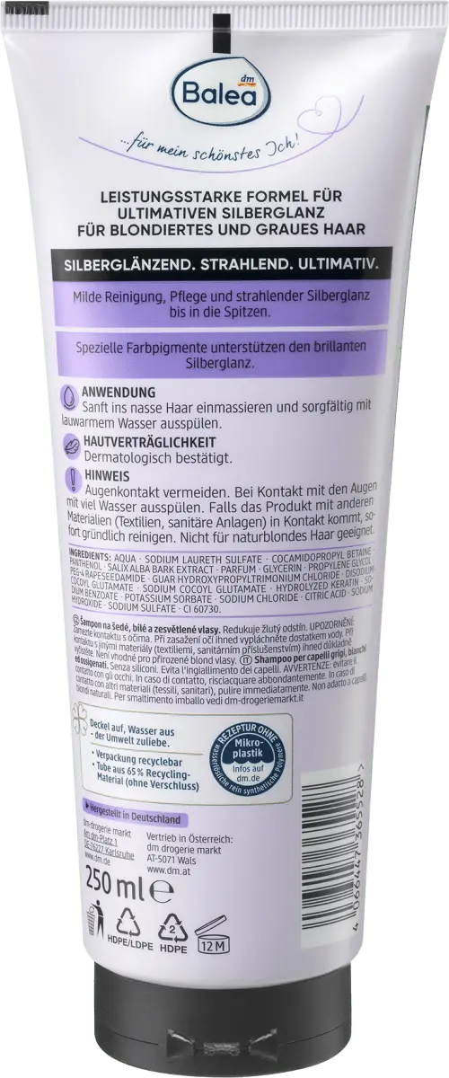 Шампунь с серебряным блеском от Balea Professional Его мощная формула обеспечивает непревзойденный серебристый блеск осветленным и седым волосам. Формула ухода с экстрактом белой ивы и кератином бережно очищает волосы и придает им сияющий серебристый блеск вплоть до самых кончиков. Специальные цветные пигменты поддерживают блестящий серебристый блеск. Рецепт без микропластика и водорастворимых, чисто синтетических полимеров.