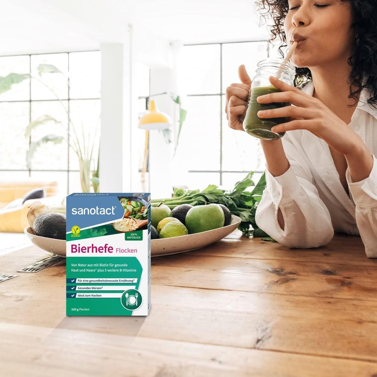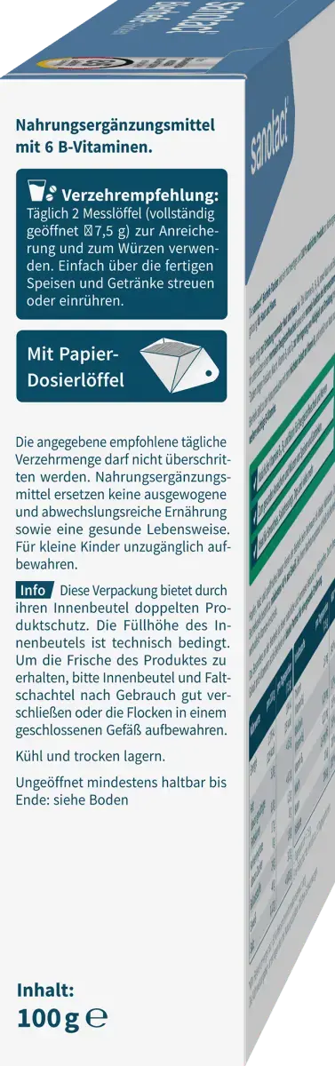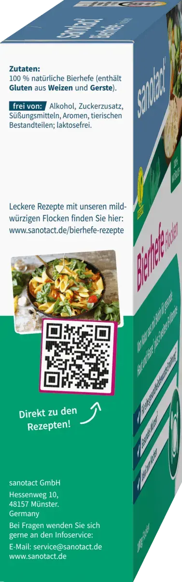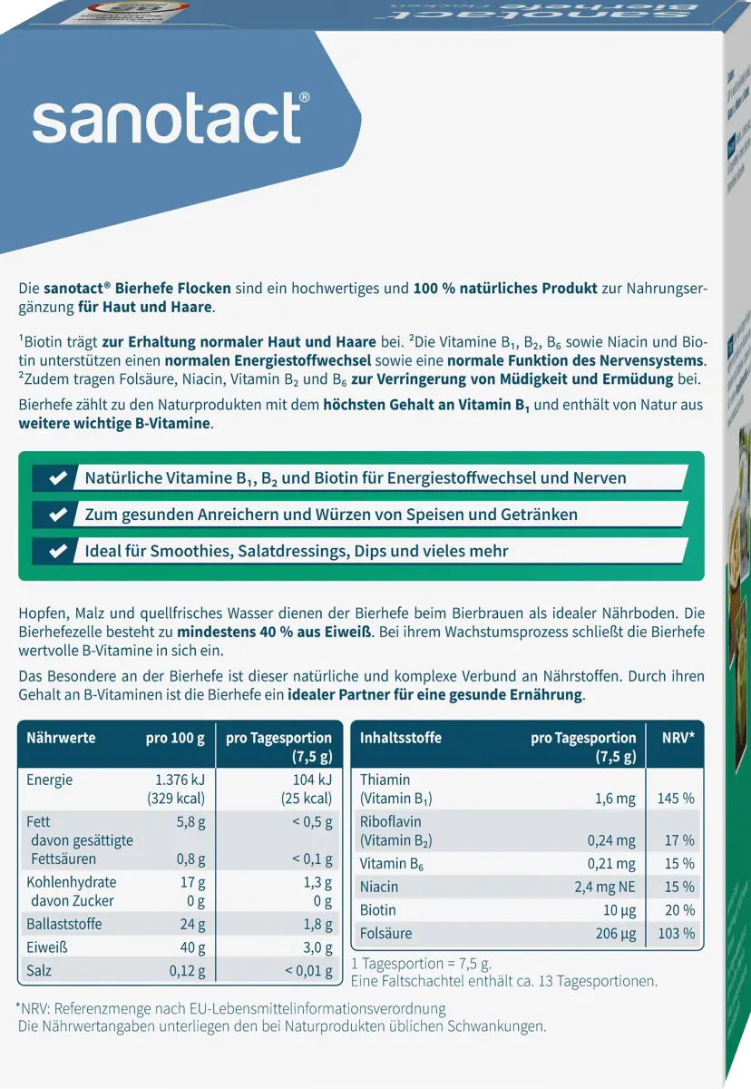 Хлопья пивных дрожжей Sanotact – это 100% натуральный продукт. Слегка острые хлопья содержат 6 витаминов группы В и идеально подходят для приправы к еде и напиткам. С биотином для поддержания нормального состояния волос и кожи.