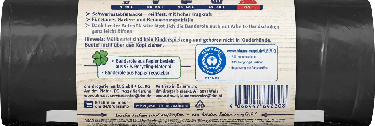 Сверхпрочный мешок из Profissimo Nature отличается особой прочностью и выдерживает вес до 30 килограммов. Черный мешок для мусора, на 95 % изготовленный из переработанной бумаги, а материал на 85 % из переработанного пластика, впечатляет не только своей особенно высокой вместимостью.