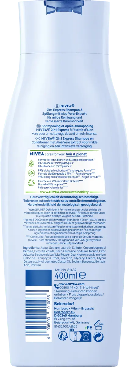 Шампунь и кондиционер NIVEA 2in1 Care Express мгновенно придает вашим волосам естественный блеск. Оптимизированная с учетом pH формула средства 2-в-1 с алоэ вера и сывороткой для блеска NIVEA интенсивно питает волосы. Формула также работает в гармонии с естественным значением pH волос и кожи головы. Уход 2-в-1 обеспечивает здоровье волос и бережное очищение кожи головы. Формула Care Express 2in1 также на 99% биоразлагаема в соответствии со стандартами ОЭСР или эквивалентными, веганская, полностью не содержит ингредиентов животного происхождения или ингредиентов животного происхождения, не содержит силиконов, твердых частиц микропластика (согласно определению ЮНЕП) и флакона (без крышка и этикетка) изготовлены на 96 % из переработанного материала.