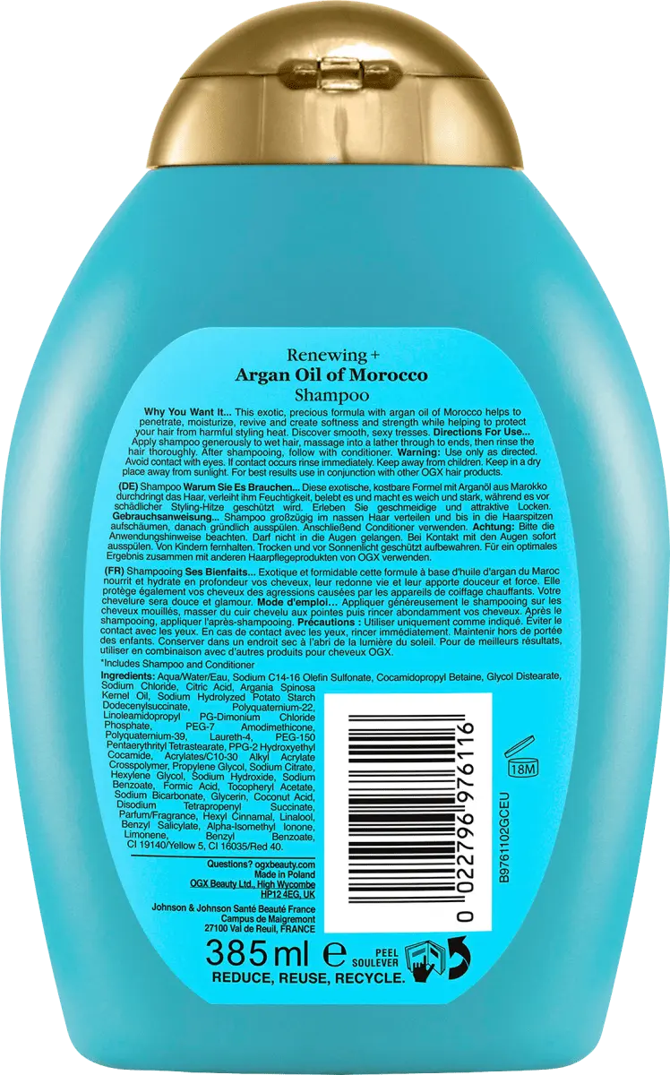 Состав: вода/вода/вода, олефин натрия C14-16. Сульфонаты, кокамидопропилбетаин, хлорид натрия, дистеарат гликоля, лимонная кислота, масло ядер аргании спинозы, гидролизованный натрием додеценилсукцинат картофельного крахмала, поликватерниум-22, линолеамидопропилPG-димоний хлорид фосфат, ПЭГ-7 амодиметикон, поликватерниум-39, лаурет-4, ПЭГ. -150 Пентаэритриттетрастеарат, PPG-2 гидроксиэтилкокамид, акрилаты/C10-30 алкилакрилатный кроссполимер, пропиленгликоль, цитрат натрия, гексиленгликоль, гидроксид натрия, бензоат натрия, муравьиная кислота, токоферилацетат, бикарбонат натрия, глицерин, кокосовая кислота, динатрий. Тетрапропенилсукцинат, отдушка/ароматизатор, гексилциннамал, линалоол, бензилсалицилат, альфа-изометилионон, лимонен, бензилбензоат, CI 19140/Yellow 5, CI 16035/Red 40.