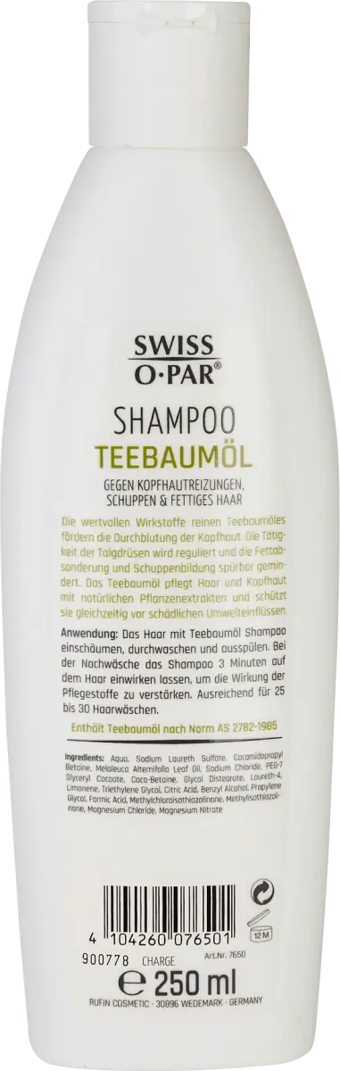 Шампунь с чайным деревом Swiss-O-Par борется с раздражением кожи головы, перхотью и предотвращает жирность волос. Содержание масла австралийского чайного дерева успокаивает и улучшает кровообращение в коже головы. Натуральные растительные экстракты также защищают волосы от вредного воздействия окружающей среды. Веган.