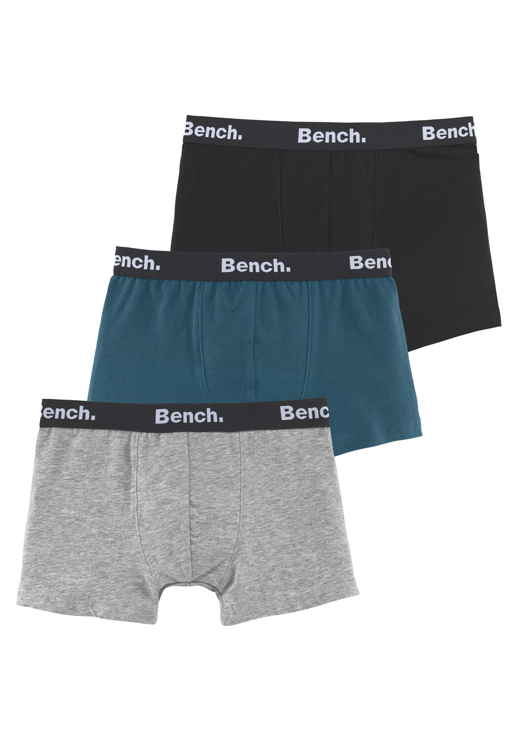 Удобные боксеры для мальчиков от Bench в упаковке 3 штуки. Пояс из эластичной ткани с надписью бренда. В 3-х разных однотонных цветах. Идеальная посадка благодаря эластичному хлопку.