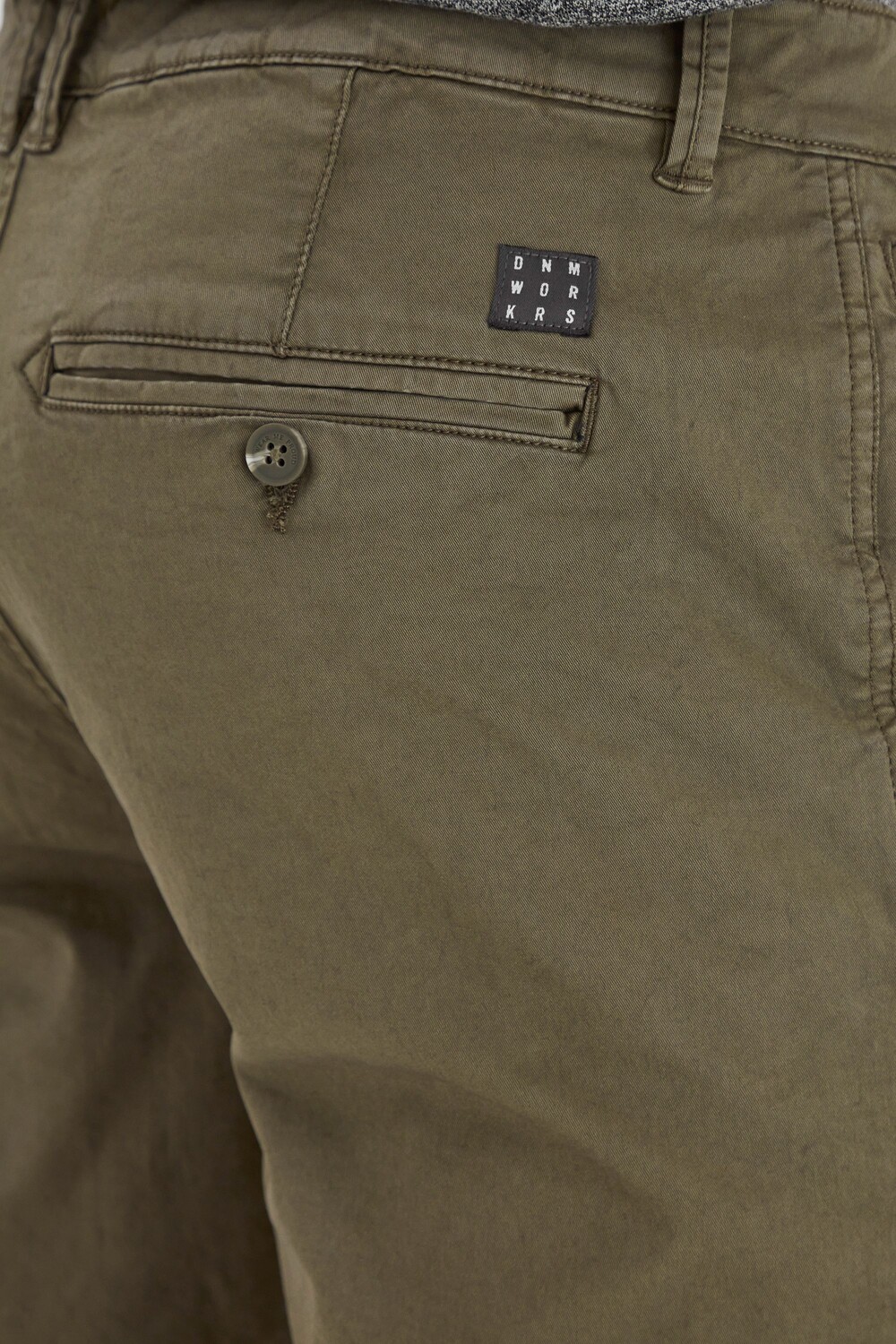 ДЕТАЛИ И ОСОБЕННОСТИ: Шорты-чиносы стандартного кроя, с эластичным материалом, застежка на молнию и пластиковые пуговицы, тканевая нашивка над правым задним карманом, два прорезных кармана спереди и 2 задних кармана сзади, подвернутые края, карманы с окантовкой. , детальная тесьма на внутренней стороне пояса.