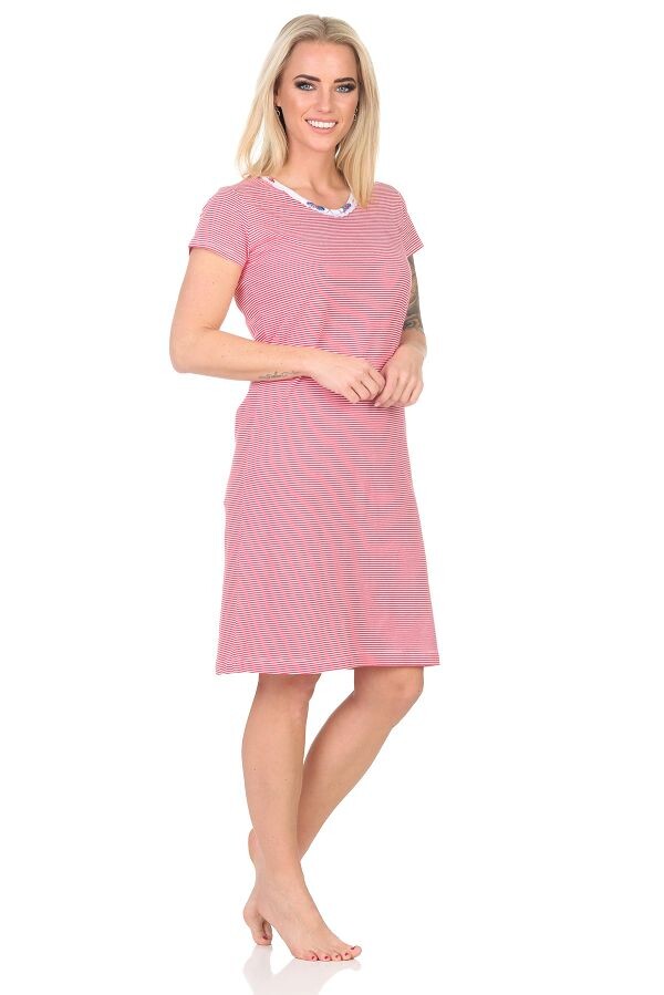 Все всегда зависит от деталей, и у этой женской ночной рубашки с короткими рукавами много красивых: ночная рубашка имеет полосатый вид, окрашенный в пряжу, и имеет контрастный вырез, который также декорирована тонким кружевом, что подчеркивает качество этой ночной рубашки.