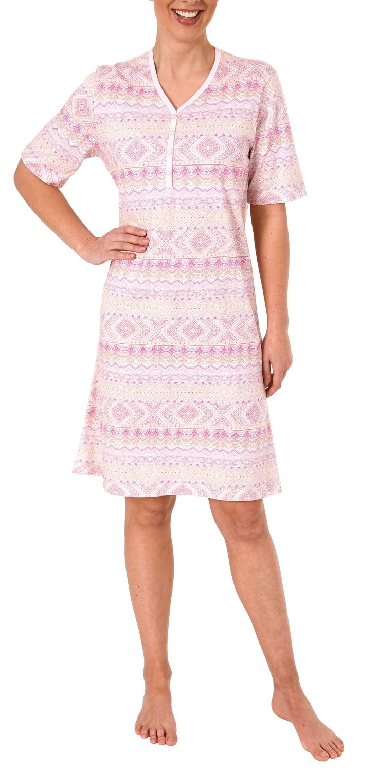 Замечательная женская ночная рубашка с короткими рукавами в летних тонах в этническом стиле и с планкой на пуговицах на шее для удобной посадки.