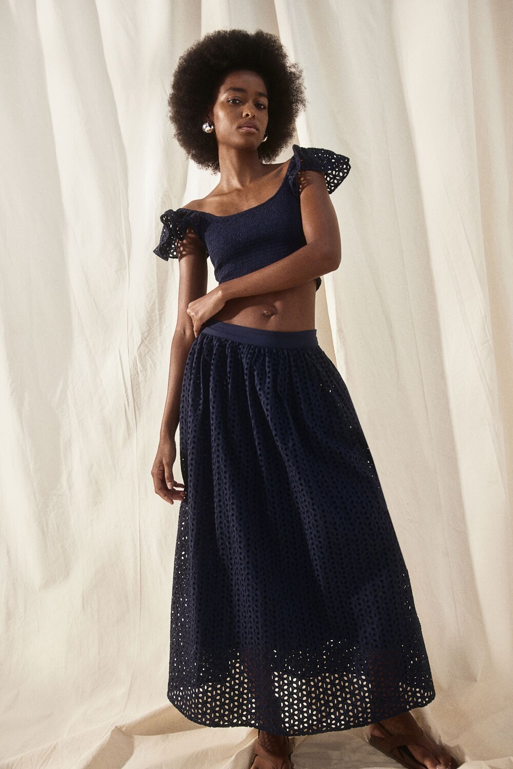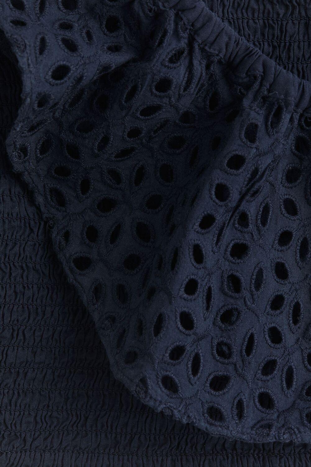 Укороченный топ, облегающий фигуру, из хлопковой ткани. Глубокий круглый вырез горловины, эластичная сборка по центру и короткие рукава с рюшами и английской вышивкой.