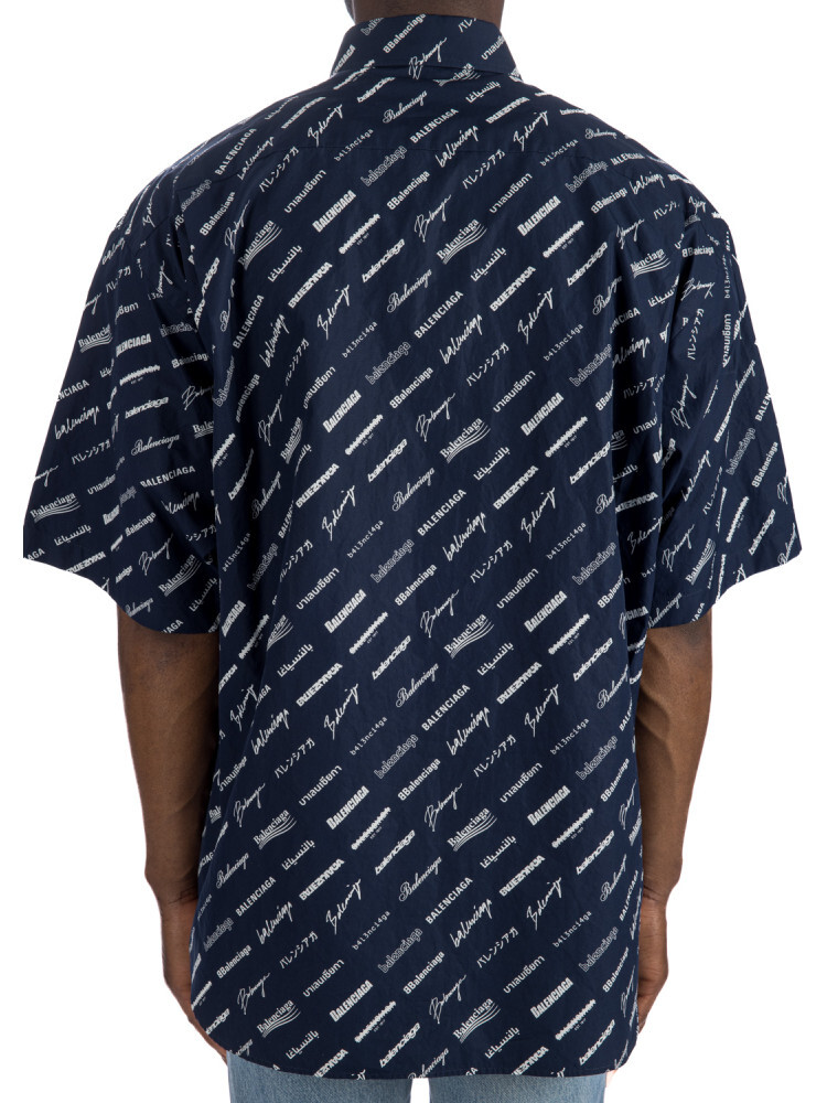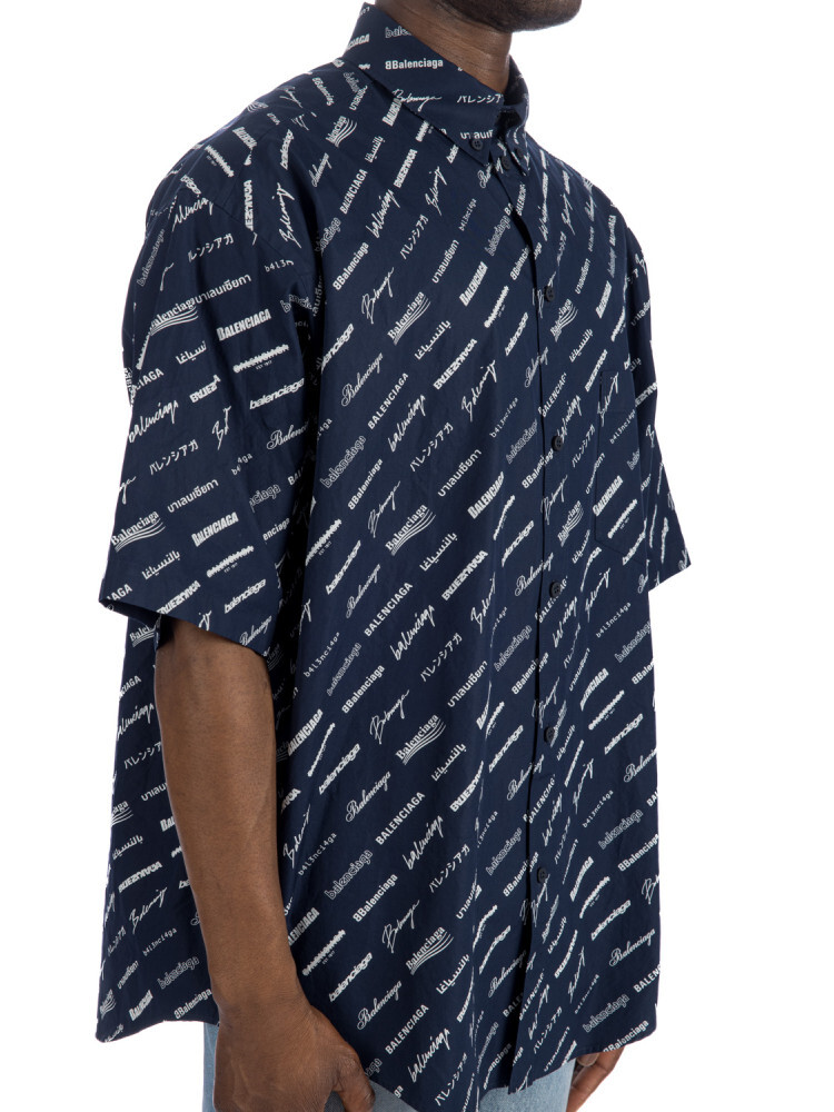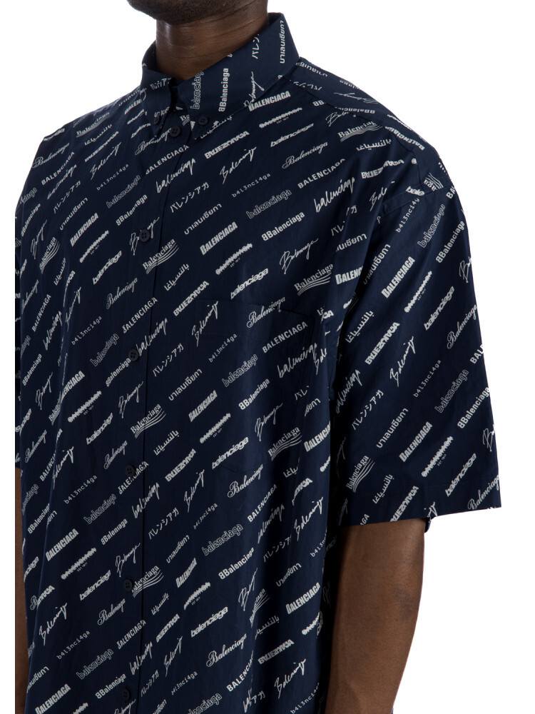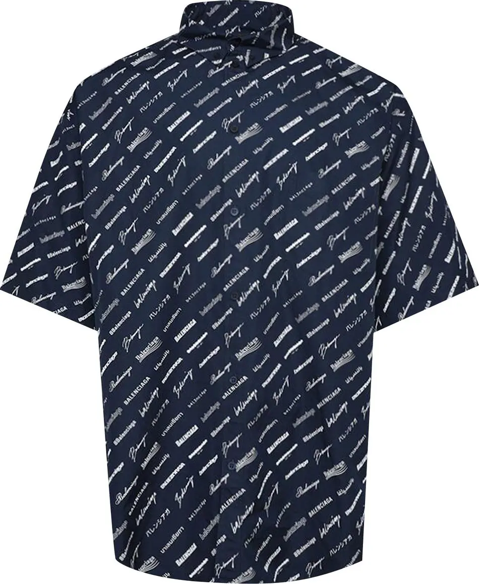 Темно-синяя рубашка с принтом логотипа Balenciaga All-over — стильный выбор с ярким узором и узнаваемым логотипом бренда. Эта рубашка имеет воротник на пуговицах и нагрудный карман для дополнительной функциональности. Короткие рукава придают модели повседневный вид. Эта рубашка большого размера обеспечивает комфорт и современный стиль.