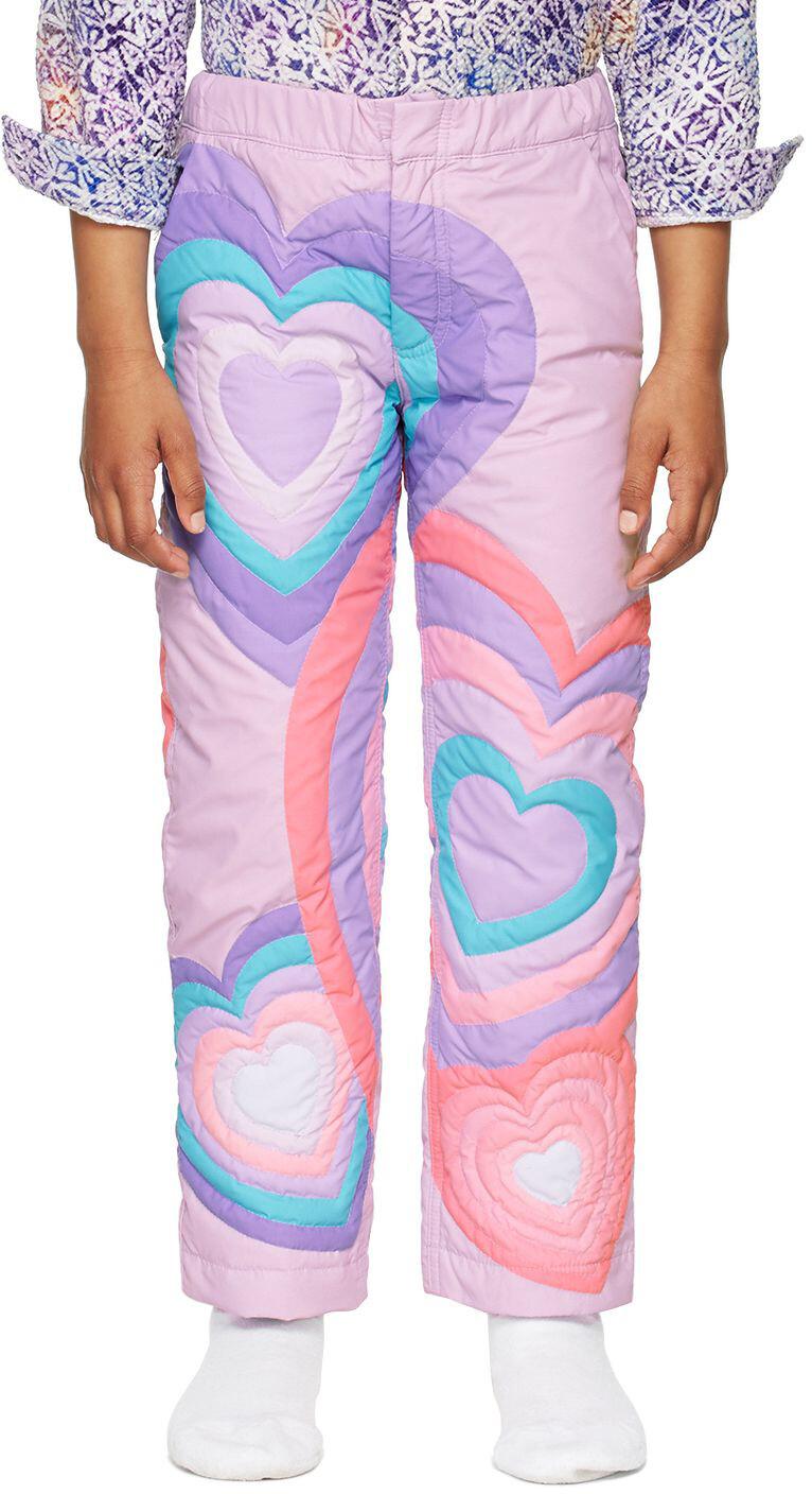 Брюки прямого кроя из стеганого твила с пуховым наполнителем в лиловых тонах. Графический рисунок повсюду.