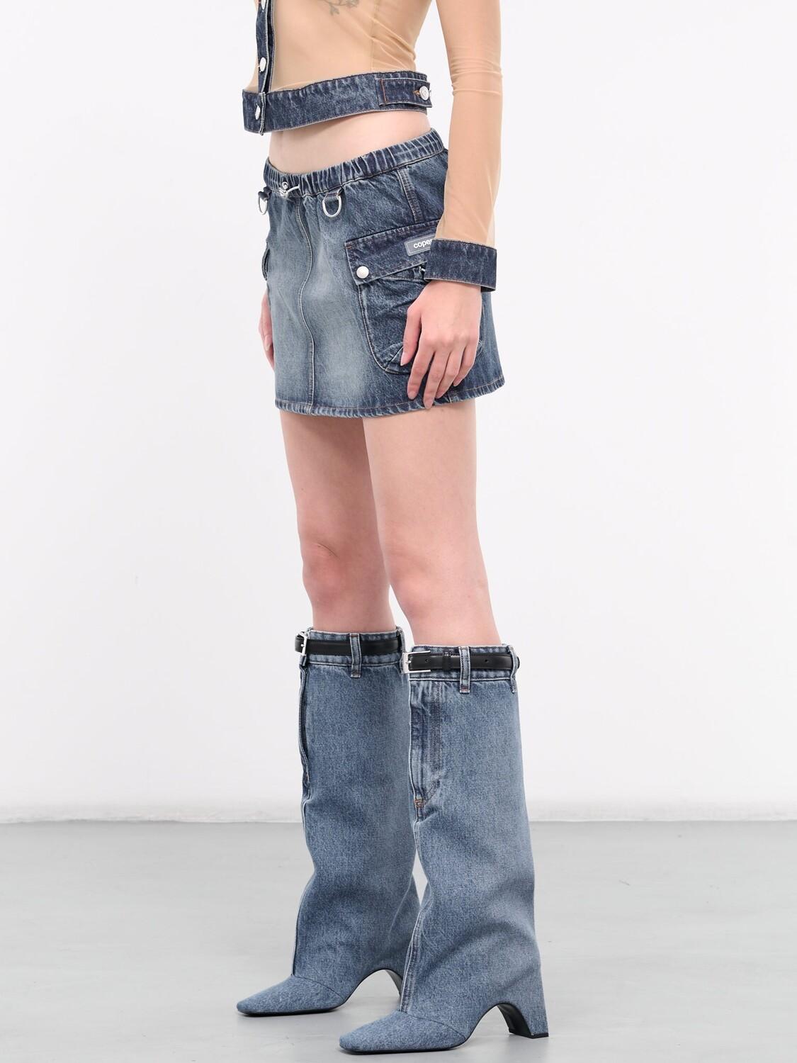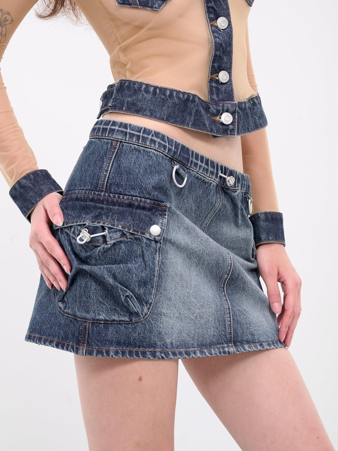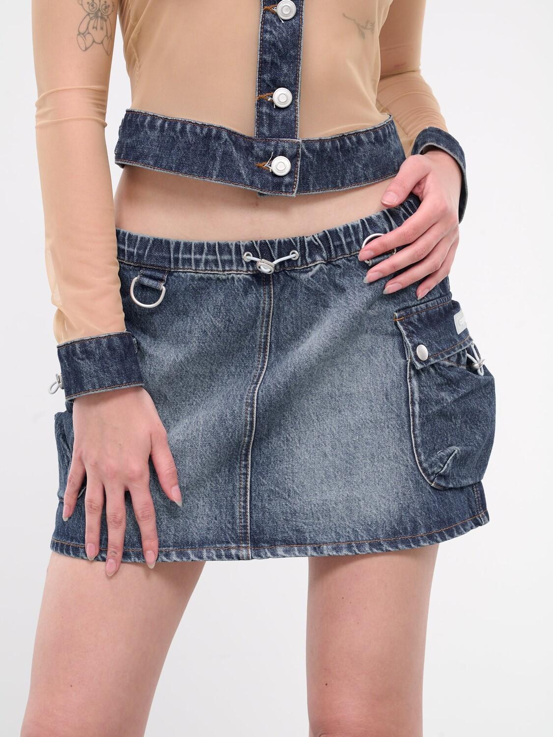 Юбка COPERNI синего цвета, джинсовая конструкция со вставками, эффект выцветания, эластичный пояс, регулируемый шнурок, D-образное кольцо, боковые карманы-карго и нашивка с логотипом, прямой низ, мини-длина, облегающий крой.