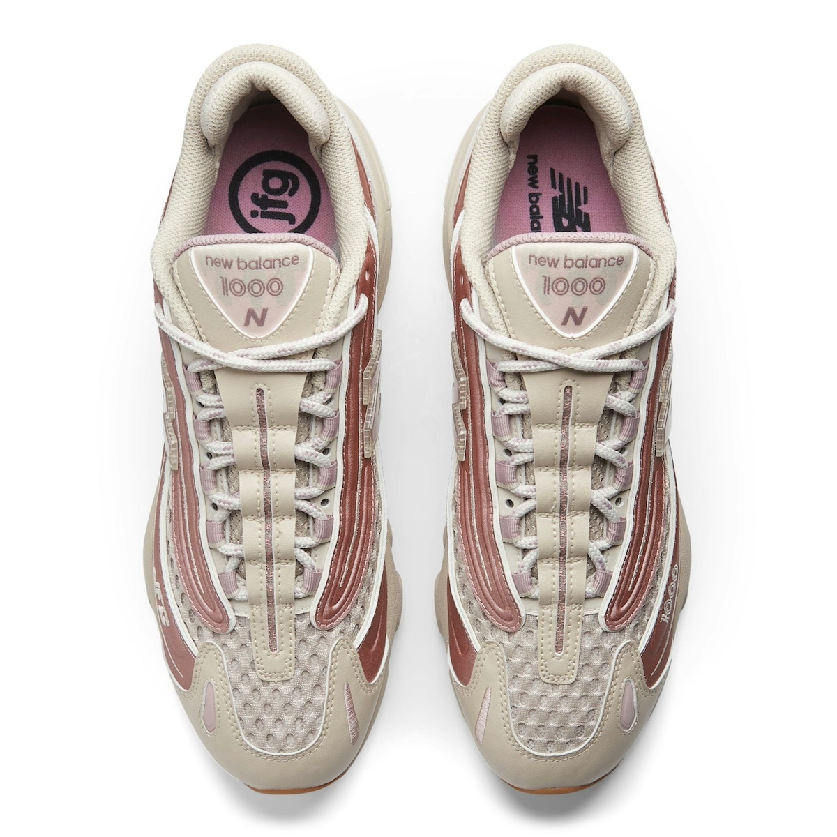 В кроссовках Joe Freshgoods x New Balance 1000 Black Ice, созданных на основе When Things Were Pure Pack, используется кремовое-бежевая сетка с кожаными накладками оттенков слоновой кости и розового металлика. Прорезиненный логотип «N» украшает боковую панель а эмблема «jfg» украшает язычок сзади. Символы «1000» и «JFG» вышиты на боковой части. На межподошву нанесена сплошная черная отделка, изготовленная из полиуретана. Амортизации ABZORB, а также усиленная прочная резиновая подошва.
