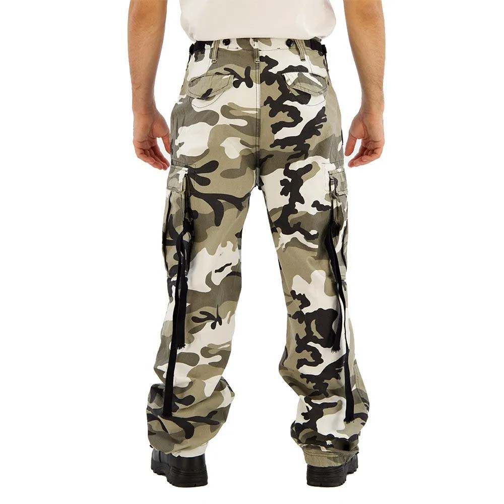 свободный крой, прикрепленные ремни на ножках и карманах, винтажный вид.
