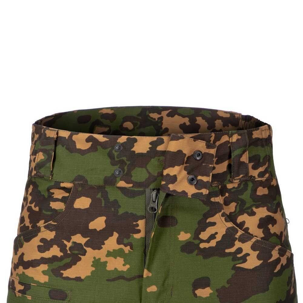 Они изготовлены из ткани Rip-Stop (65% хлопка / 35% полиэстера), которая делает брюки легкими и прочными. Они также быстро сохнут – неважно, жаркий потный день или дождливая погода. Под поясом и вокруг колен расположена эластичная ткань, обеспечивающая комфорт и высокую мобильность. Дополнительный уровень защиты обеспечивают входящие в комплект накладки, предназначенные для защиты суставов за счет эффективного распределения энергии удара. В распоряжении пользователя несколько карманов: 2 открытых на талии, 2 больших грузовых кармана с каждой стороны задней части бедра с крючком. и застежками-петлями, а также 2 средних кармана спереди, 2 небольших кармана в области голенища и еще 2 кармана сзади на брюках. Спереди мы можем найти высококачественную молнию YKK с застежкой-липучкой. Ремешок вокруг внутреннего пояса позволяет регулировать размер. Подобные ремешки расположены вокруг лодыжек, чтобы регулировать посадку по размеру обуви пользователя. Большие петли для ремня позволяют использовать широкий спектр тактических ремней.
