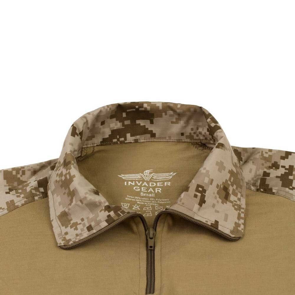 Компания Invader Gear была основана в 2004 году и всегда концентрировала свое внимание на оборудовании с выдающимся соотношением цены и качества. В основном бренд предлагает большой выбор тактической одежды современного дизайна в широком диапазоне цветов и камуфляжных рисунков, а также все виды нейлонового тактического снаряжения, такого как жилеты, переноски для пластин, подсумки MOLLE, рюкзаки, защитные накладки, стропы и многие другие товары. следуя той же философии. Боевая рубашка Invader Gear предназначена для обеспечения превосходных влагоотводящих свойств под бронежилетом. Современный крой разработан для оптимального прилегания к пользователю. Высокий воротник предназначен для защиты шеи от мусора и строп-ремней и оснащен качественной молнией YKK. Большие наплечные карманы обеспечивают быстрое и удобное хранение, а на внешнем слое расположены большие панели с крючками и петлями для идентификационных знаков подразделения или нашивок боевого духа. Локти усилены дополнительным слоем ткани, который служит отделением для налокотников. Ширина конца рукава полностью регулируется. Рукава, воротник и область плеч этой боевой рубашки изготовлены из прочного тканого материала рип-стоп, состоящего из 60 % хлопка и 40 % полиэстера, что обеспечивает максимальный комфорт при ношении и быстрое высыхание. Торс изготовлен из невероятно удобного трикотажного полотна, состоящего из 50 % хлопка и 50 % полиэстера, с хорошими влагоотводящими свойствами.