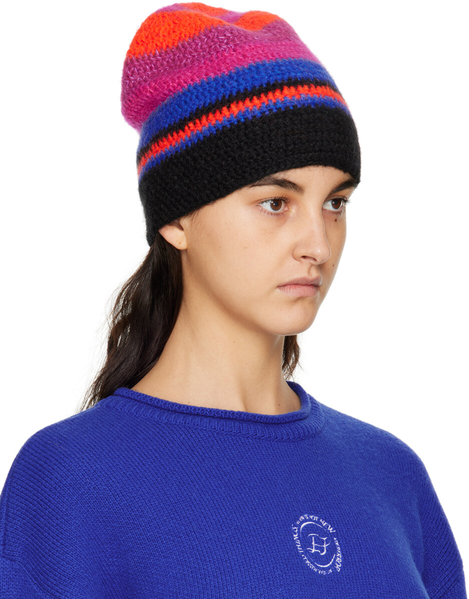 Вязаная крючком шапка из смеси хлопка и акрила с разноцветным полосатым узором.