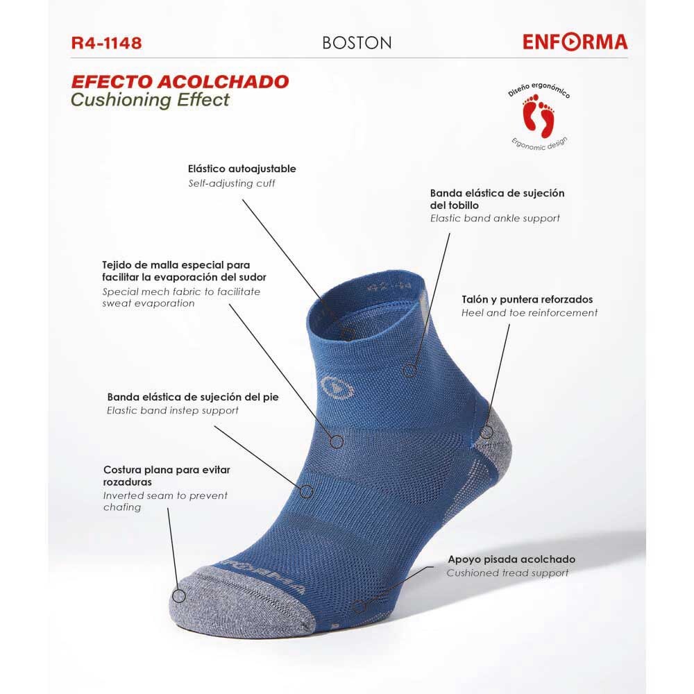 Саморегулирующаяся резинка Специальная сетчатая ткань, способствующая испарению пота Эластичный поддерживающий пояс для лодыжки Плоский шов для предотвращения натирания Анатомическая защита лодыжки Усиленная пятка и носок Мягкая поддержка протектора Анатомический дизайн.