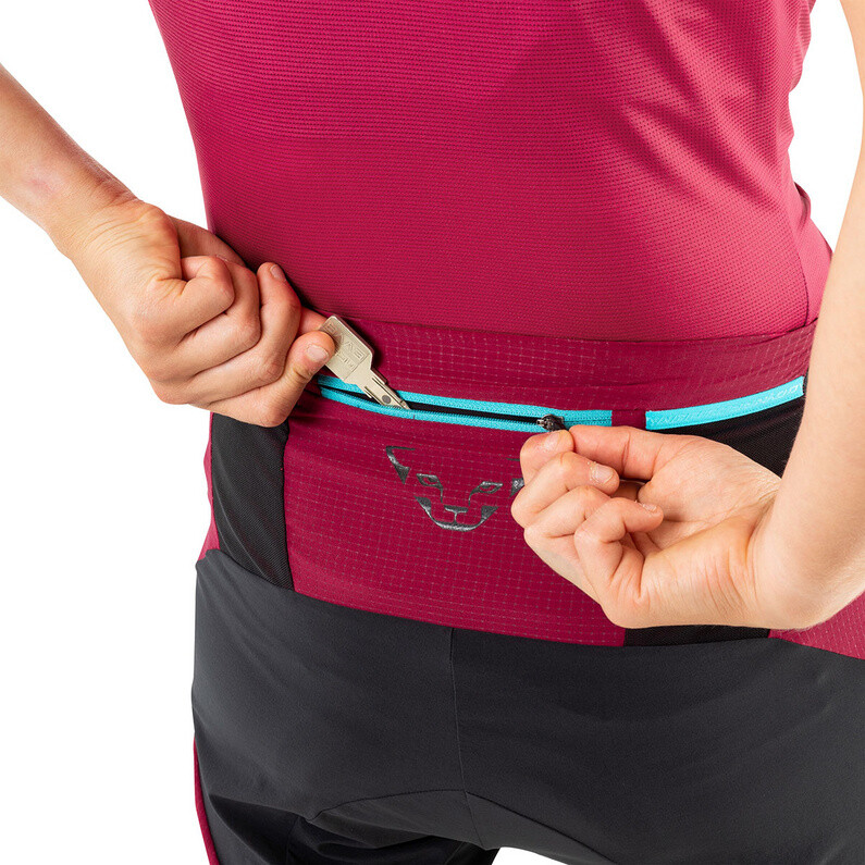 В общей сложности вы найдете три кармана на задней части мягкой куртки. облегающий пояс. Там вы храните ключ в кармане на молнии, гель, планку и повязку на голову в сетчатых карманах.