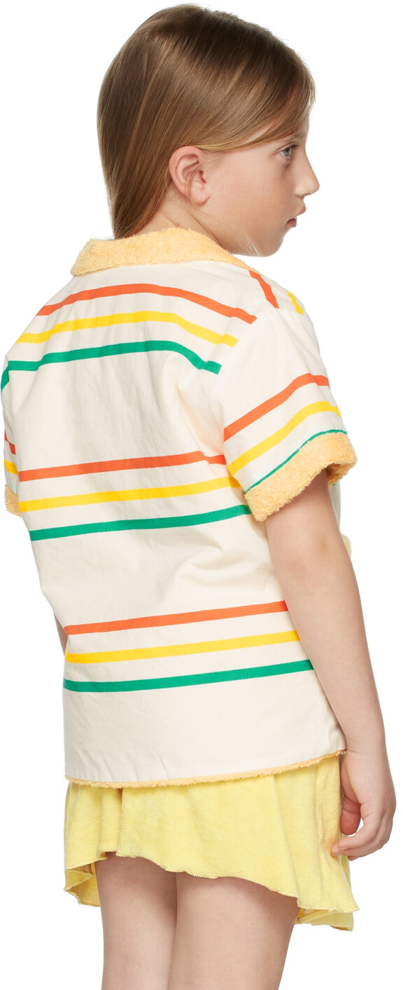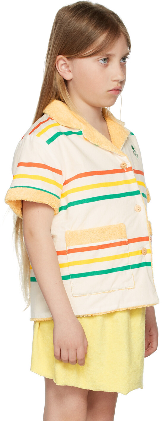 Жакет из гладкой хлопковой ткани с короткими рукавами кремового цвета с полосками красного, желтого и зеленого цветов. Отделка из махровой ткани желтого цвета.