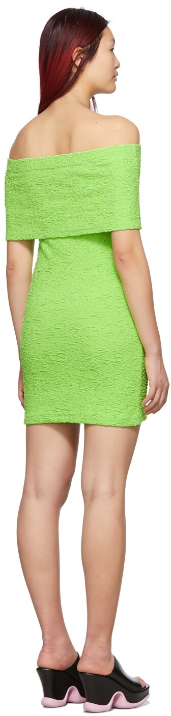 Зеленое короткое платье с открытыми плечами из хлопково-нейлонового трикотажа без рукавов.