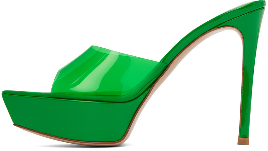 Зеленые прозрачные босоножки на каблуке из ТПУ и лакированной кожи.