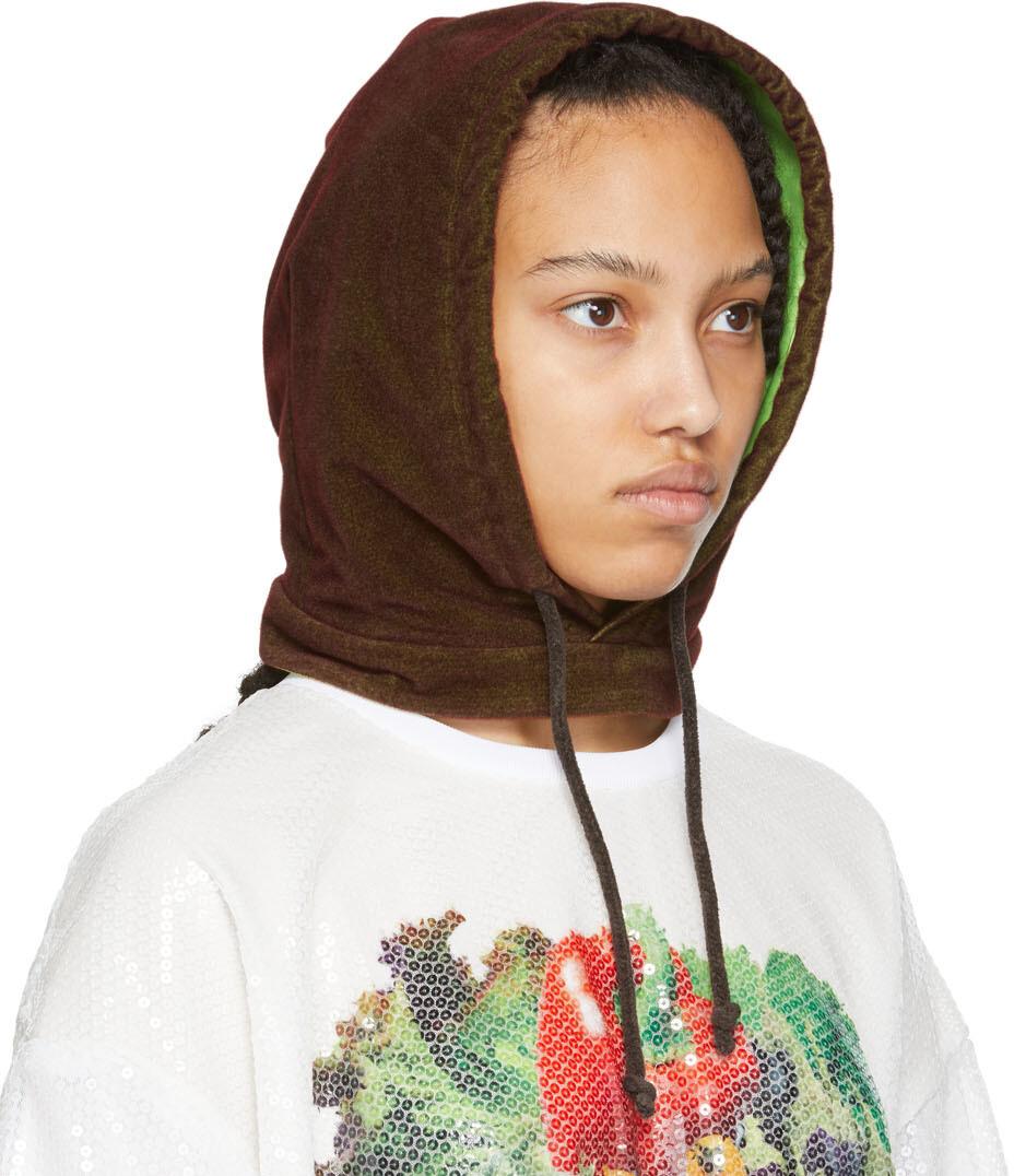 Коричневая и зеленая бархатная шапка-капюшон с полиуретановым покрытием и вышитым логотипом зеленого, красного и белого цветов на лицевой стороне.