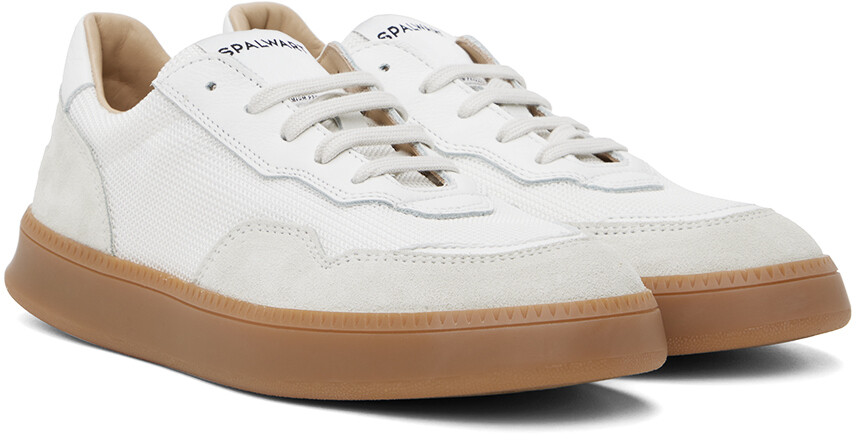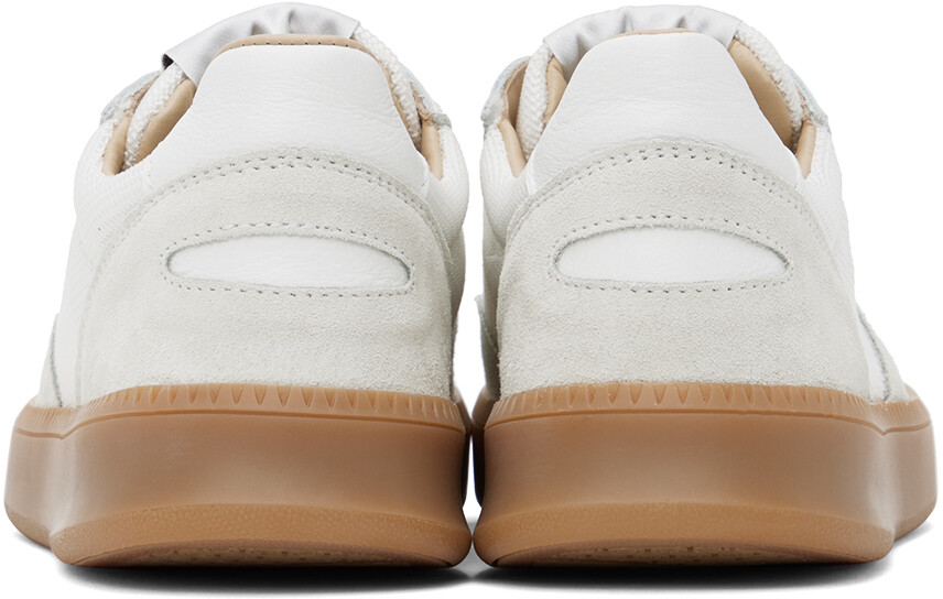 Кроссовки из холщовой ткани, кожи наппа и замши с низким верхом, со вставками, кремового и серого цветов.