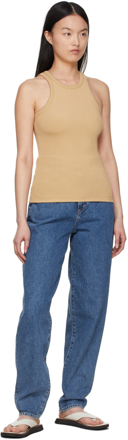 Майка без рукавов в рубчик из смесовой вискозы бежевого цвета. Воротник с круглым вырезом.