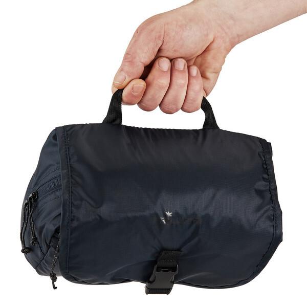 Экологичная сумка для туалетных принадлежностей С Rousay вам не придется решать, потому что это одновременно и пеленальный мешок, и сумка для туалетных принадлежностей. Новая версия изготовлена ​​из переработанного материала. Мешок для стирки среднего размера имеет откидную крышку с крючками, на которые можно повесить Rousay классическим способом. В крышке также расположено зеркало на липучке и сетчатый отсек для влажных вещей, таких как бритвы и зубные щетки. Внизу висит просторная сумка для туалетных принадлежностей с местом для больших бутылок шампуня.