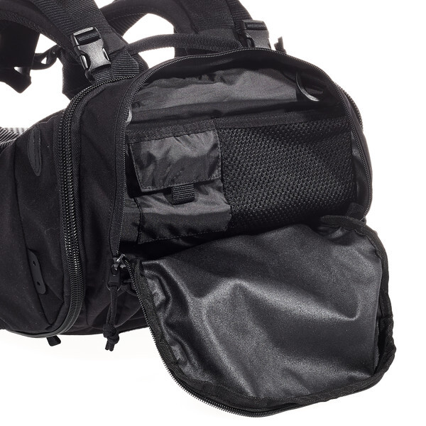 Система переноски оборудована с мягкими плавниками на бедрах и отделениями на молнии. Набедренные плавники снимаются.