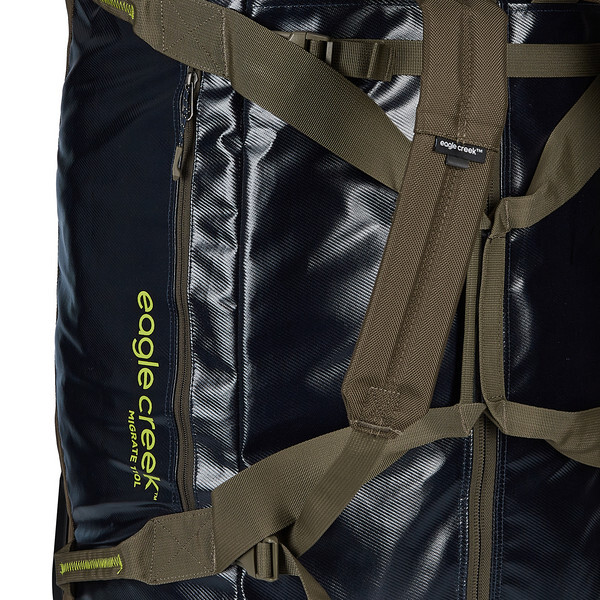 Колеса с прочным профилем позволяют тянуть прочную спортивную сумку даже по пересеченной местности. Если дорога становится слишком узкой и грязной или вам нужно быстро бежать на трассу, вы просто надеваете сумку. За прочным чехлом спрятаны удобные лямки рюкзака, которые сейчас используются. У Migrate Wheeled Duffel также есть различные ручки, которые облегчают транспортировку.