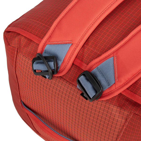 Основной материал устойчивой к истиранию дорожной сумки обладает высокими водоотталкивающими свойствами благодаря покрытию из ТПУ. Основание и боковые стенки дополнительно усилены, а в качестве точек фиксации по всему периметру используются цепочки и ручки.