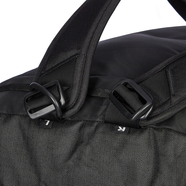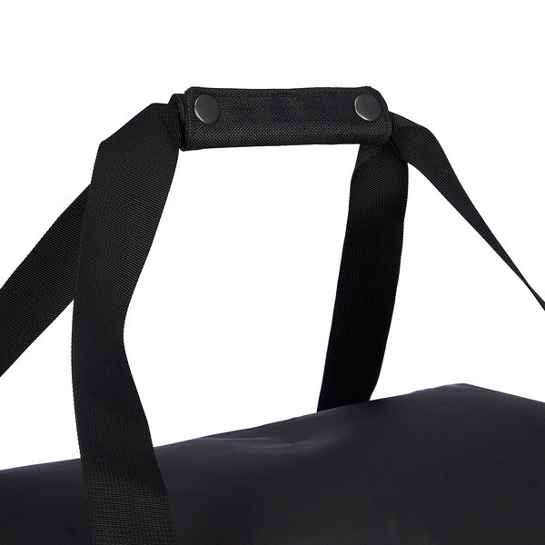Основной материал устойчивой к истиранию дорожной сумки обладает высокими водоотталкивающими свойствами благодаря покрытию из ТПУ. Основание и боковые стенки дополнительно усилены, а в качестве точек фиксации по всему периметру используются цепочки и ручки.